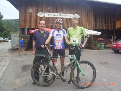 So konnte ich von km 7 bis km 154 einsam in Führung liegen. Aber nachdem am letzten Verpflegungspunkt über einen 26-Minuten- Vorsprung informiert wurde, überraschte es doch, unmittelbar danach noch überholt zu werden. Da stellt man sich natürlich die Frage, ob es nicht etwas kürzere Verpflegungspausen oder eine Gehpause weniger auch getan hätten ... Da waren die Verfolger doch in besserer Lage : die wussten beim Zieleinlauf alle bereits über den Rennverlauf Bescheid. Aber wer hier durchkommt, kann schon zufrieden sein ! Und mit meiner Leistung habe ich mich sicherlich nicht blamiert. So lief nach dem Sieger Ralf Giese in 19:25h (2013 war er 5.) ich auf Platz 2 (wie 2013 aber 23 Minuten langsamer) in 19:30h ein. Dritter wurde der 2013er Sieger Peter Flock in 19:43h, dann folgte eine Lücke von knapp einer Stunde. Und ich war sicher der einzige, der sich traut, eine solche Strecke in 10-Euro-Turnschuhen zu absolvieren ! Auch unter Mountainbikern gilt das Durchradeln des Rennsteigs am Stück als Heldentat. Und der erfahrene Langstreckenradler Jens-Peter schaffte es trotz Packtaschen, selbst an den steilsten Wurzelpassagen den Anschluss zu halten. Lediglich später freute auch er sich über befahrbare Wege anstatt Holperstrecken. |